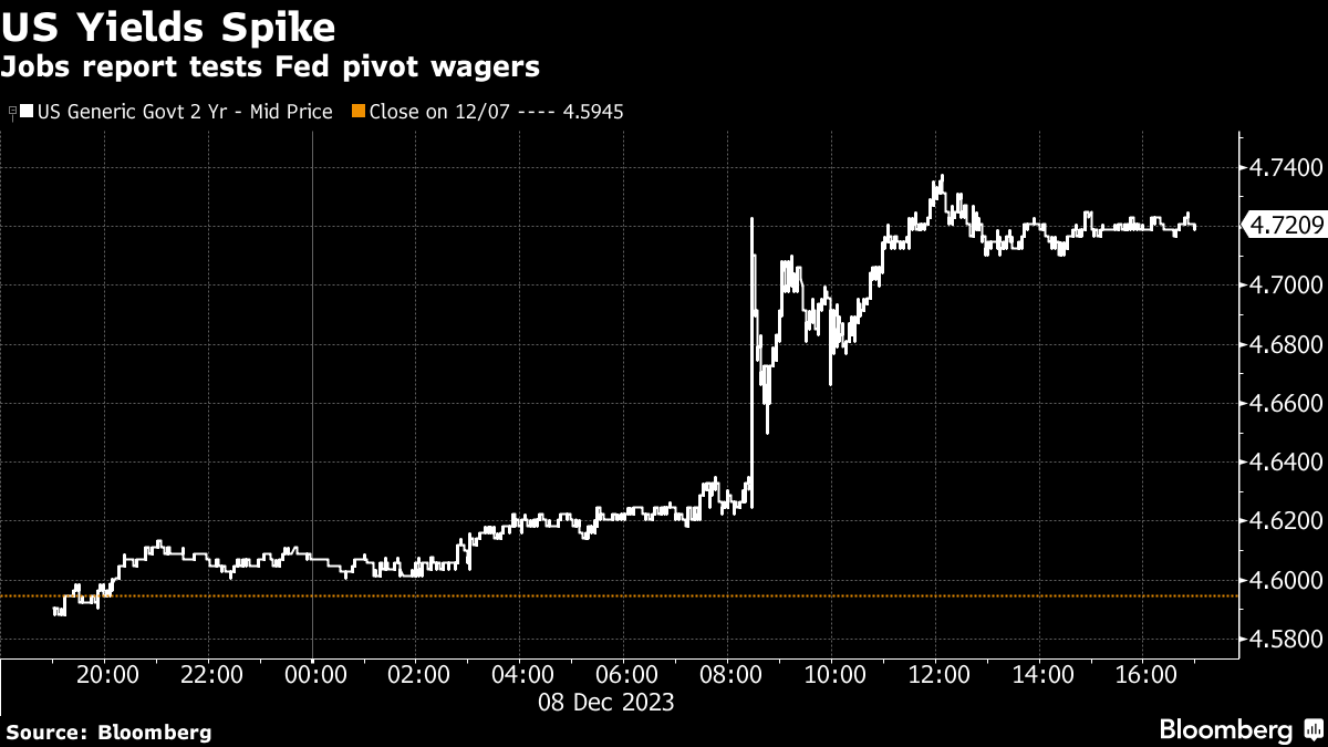 Following a slew of figures underscoring a labor-market slowdown, Friday's jobs report showed unexpected strengthening. Nonfarm payrolls increased 199,000 last month, the unemployment rate fell to 3.7% and monthly wage growth topped estimates. Meantime, US consumer sentiment rebounded sharply in early December — topping all forecasts — as households dialed back their year-ahead inflation expectations by the most in 22 years.