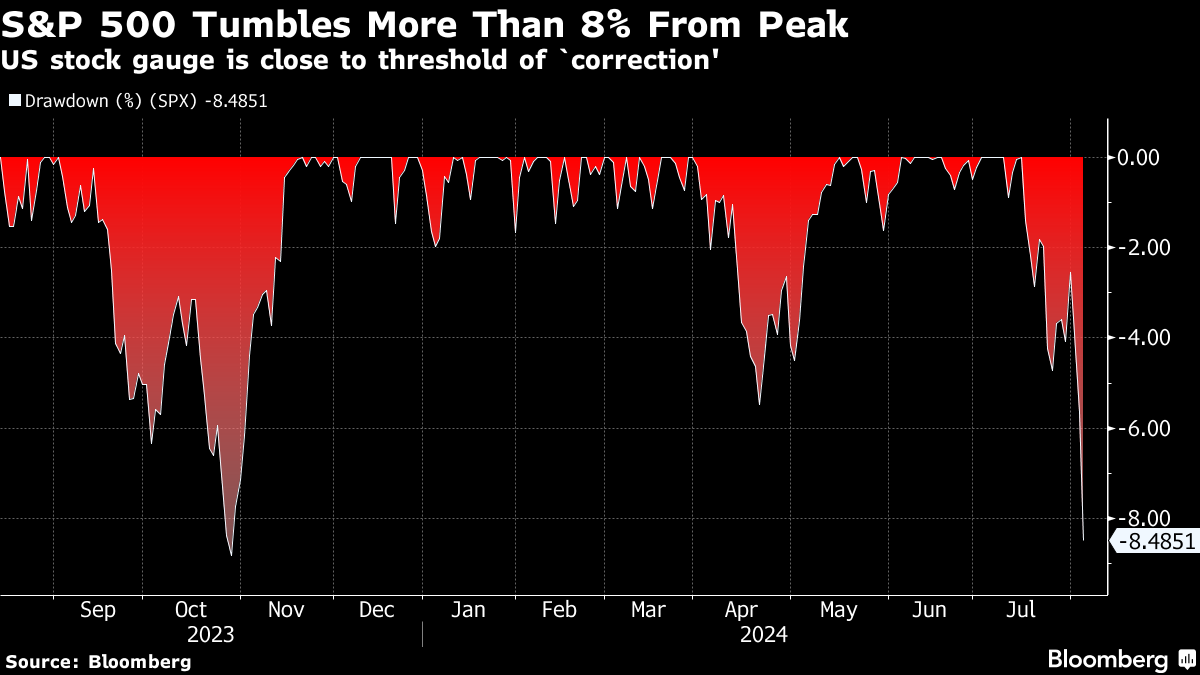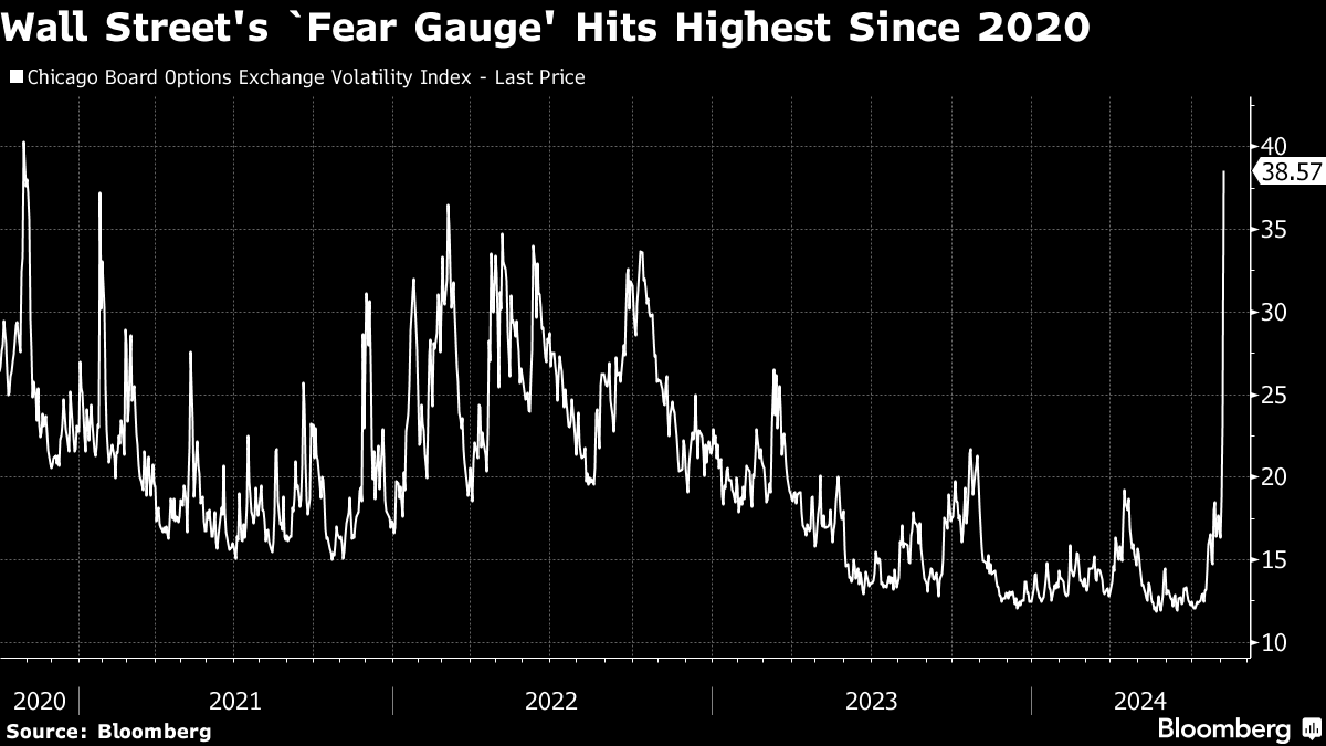 From New York to London and Tokyo, equities got pummeled. Just as markets started celebrating signals from the Federal Reserve about a first rate cut, they were hit by a perfect storm — weak economic data, underwhelming corporate earnings, stretched positioning and poor seasonal trends. While the S&P 500 pared some of its losses, it suffered the biggest plunge in about two years amid strong trading volume. The tech-heavy Nasdaq 100 saw its worst start to a month since 2008. Wall Street's “fear gauge” - the VIX - at one point registered its largest spike in data going back to 1990.