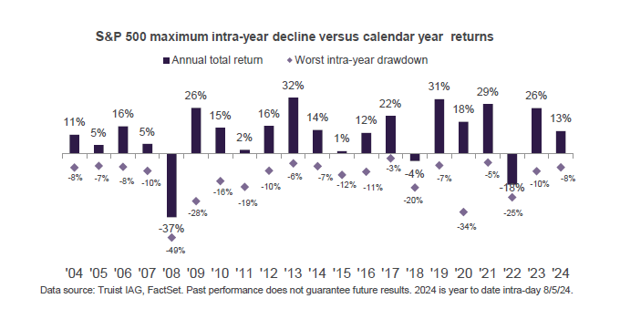 Notably, over the past 40 years, the S&P 500 has averaged a maximum intra-year pullback of 14%. Despite this, stocks have still shown an average return (not compounded) of 13% and risen in 33 out of 40 of those years, or 83% of the time, Lerner said.