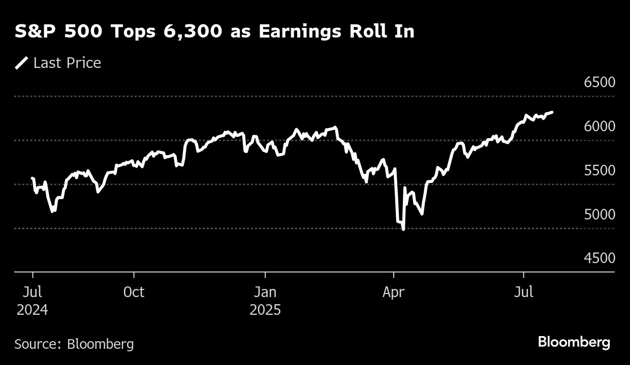In the absence of relevant economic data, Wall Street remains squarely focused on company outlooks. The S&P 500 topped 6,300. Two members of the “Magnificent Seven” megacaps — Tesla Inc. and Google parent Alphabet Inc. — are due to report results this week. The stakes will again be high as traders look for updates on artificial-intelligence spending.