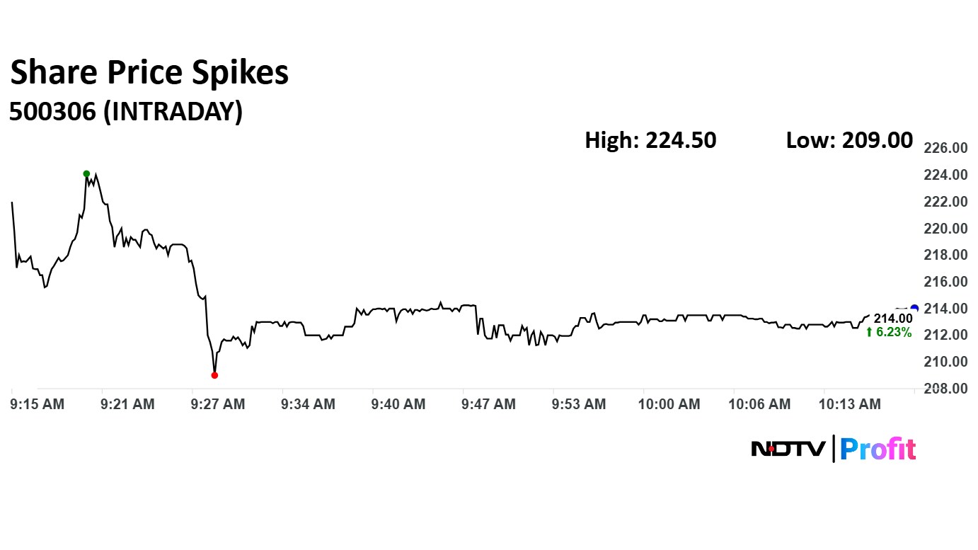 The scrip rose as much as 11.44% to Rs 224.50 apiece. It pared gains to trade 5.83% higher at Rs 213.20 apiece, as of 10:16 a.m. This compares to a flat NSE Nifty 50 Index.