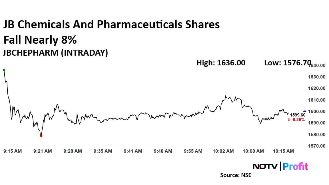 The shares of JB Chemicals And Pharmaceuticals fell as much as 7.73% to Rs 1,576.70 apiece, the lowest level since March 19. It pared losses to trade 6.81% lower at Rs 1,592.40 apiece, as of 10:15 a.m. This compares to a 0.49% advance in the NSE Nifty 50 Index.