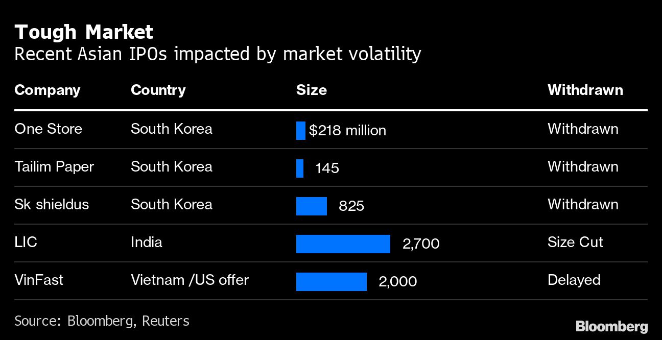 A Vietnamese electric-vehicles maker that had been flirting with a listing in the U.S. market this year said this will be postponed until 2023. Hong Kong -- usually one of Asia's busiest venues for companies going public -- hasn't seen a single IPO priced this month.