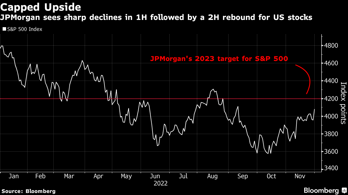 (Bloomberg) -- Sharp declines await US stocks in the first half of 2023 against the backdrop of a mild recession and Federal Reserve rate hikes, say JPMorgan Chase & Co. strategists.