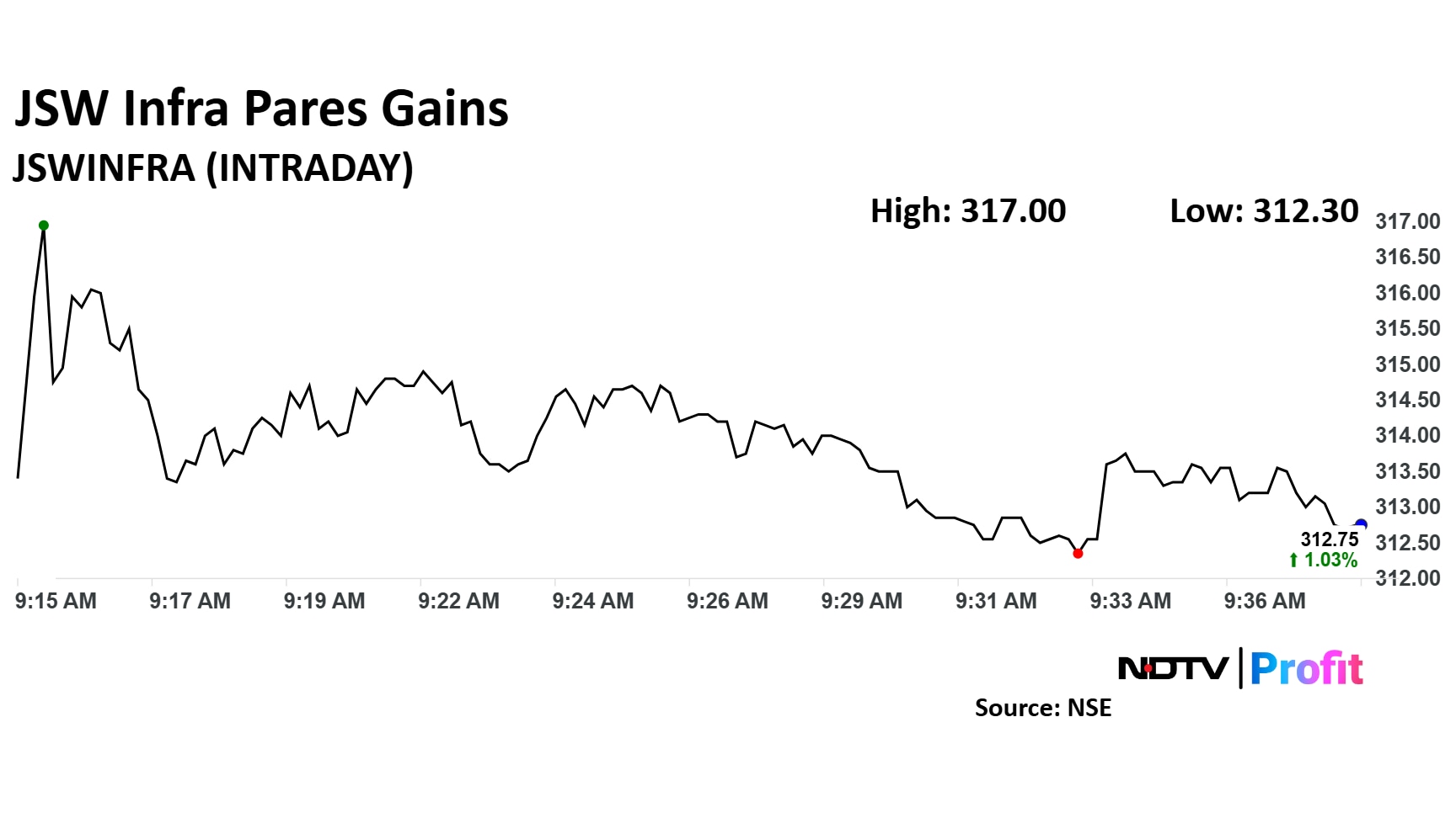 The scrip rose as much as 2.4% to Rs 317 apiece. It pared gains to trade 1.1% higher at Rs 313.05 apiece, as of 9:41 a.m. This compares to a 0.35% advance in the NSE Nifty 50 Index.