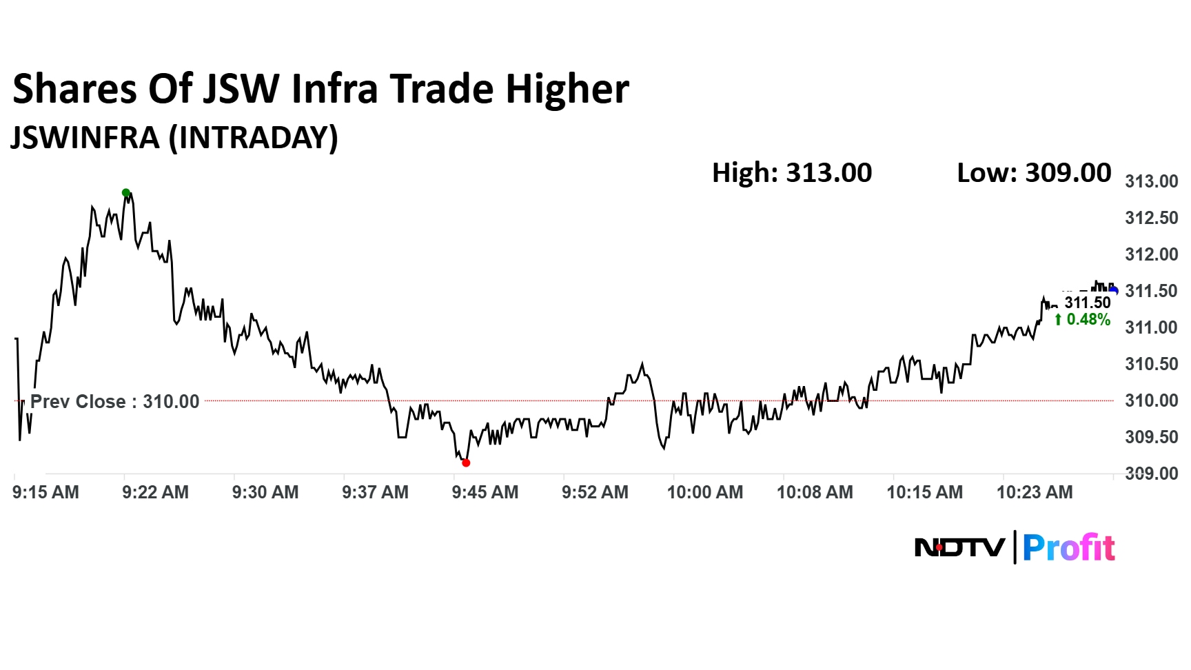 JSW Infra stock rose as much as 0.97% during the day to Rs 313 apiece on the NSE. It was trading 0.32% higher at Rs 311 apiece, compared to a 0.23% decline in the benchmark Nifty 50 as of 11:12 a.m.
