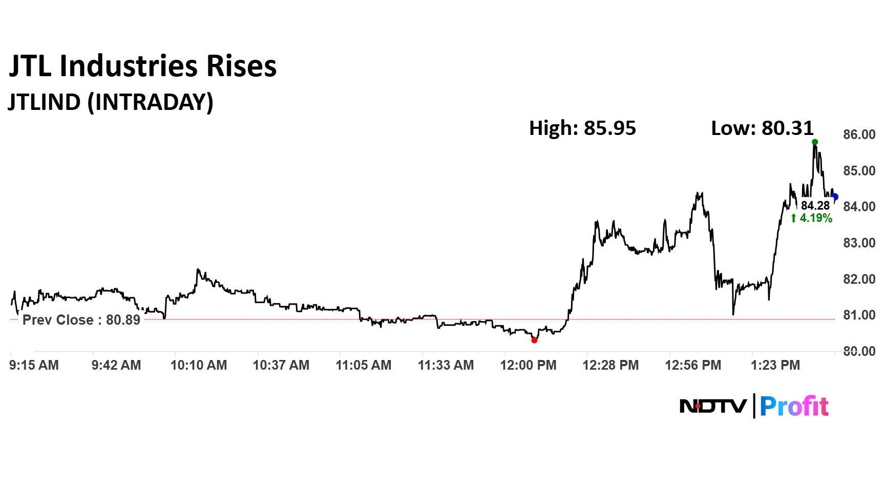 JTL Industries' share price jumped 6.26% to Rs 85.96 apiece, the highest level since March 6. The share price was trading 3.65% higher at Rs 83.74 apiece as of 2:07 p.m., as compared to a 0.21% decline in the NSE Nifty 50.