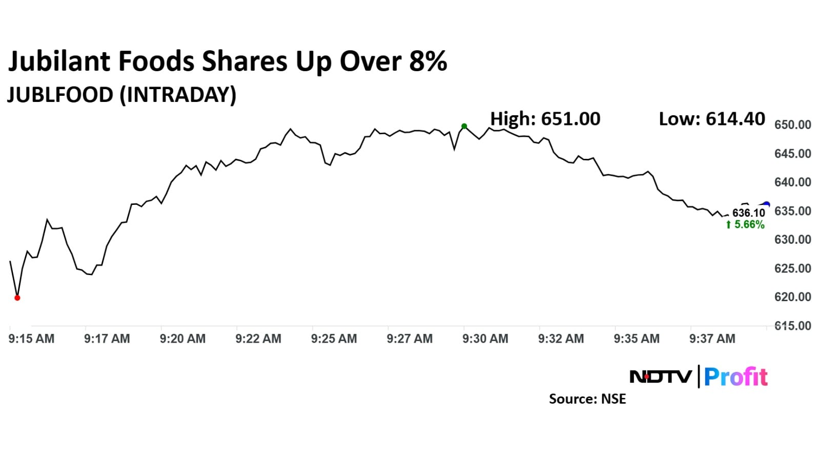 Jubilant FoodWorks stock rose as much as 8.14% during the day to Rs 651 apiece on the NSE. It was trading 6.25% higher at Rs 639.65 apiece, compared to an 0.06% advance in the benchmark Nifty 50 as of 9:43 a.m.