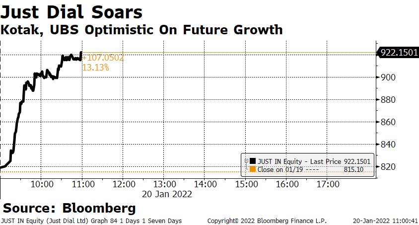 Shares of Just Dial Ltd. jumped as much as 15% as analysts bet on the search and listings platform's growth initiatives with the backing of Reliance Industries Ltd.