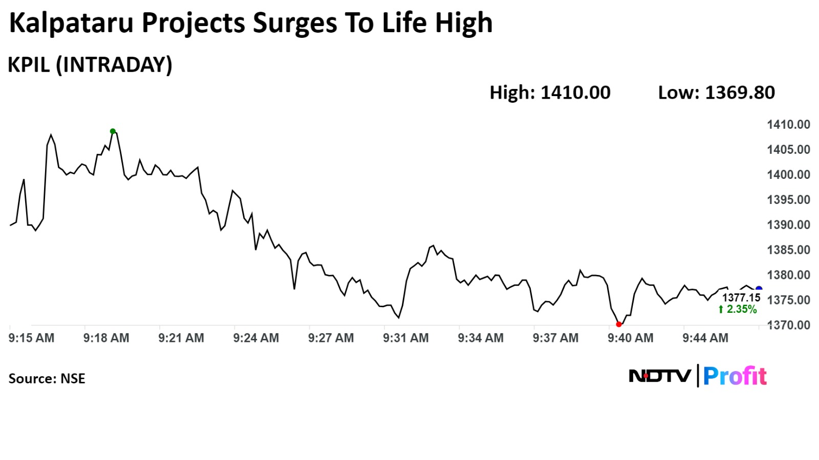Shares of Kalpataru Projects International Ltd. surged nearly 5% to an all-time high on Thursday after the company, along with its joint ventures and international subsidiaries, bagged orders worth Rs 2,995 crore.