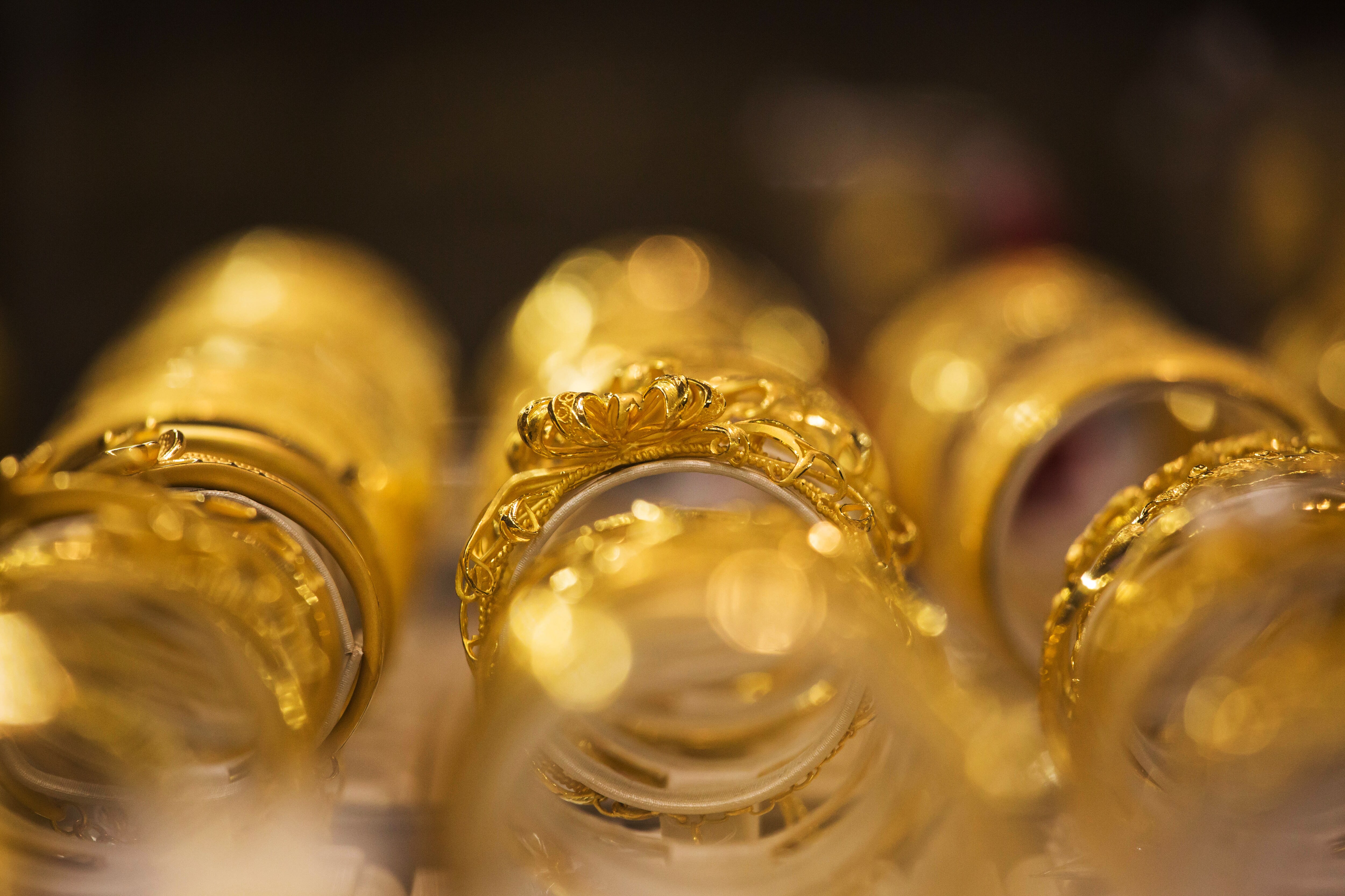 Gold bangles sit inside a display case. (Photographer: Billy H.C. Kwok/Bloomberg)