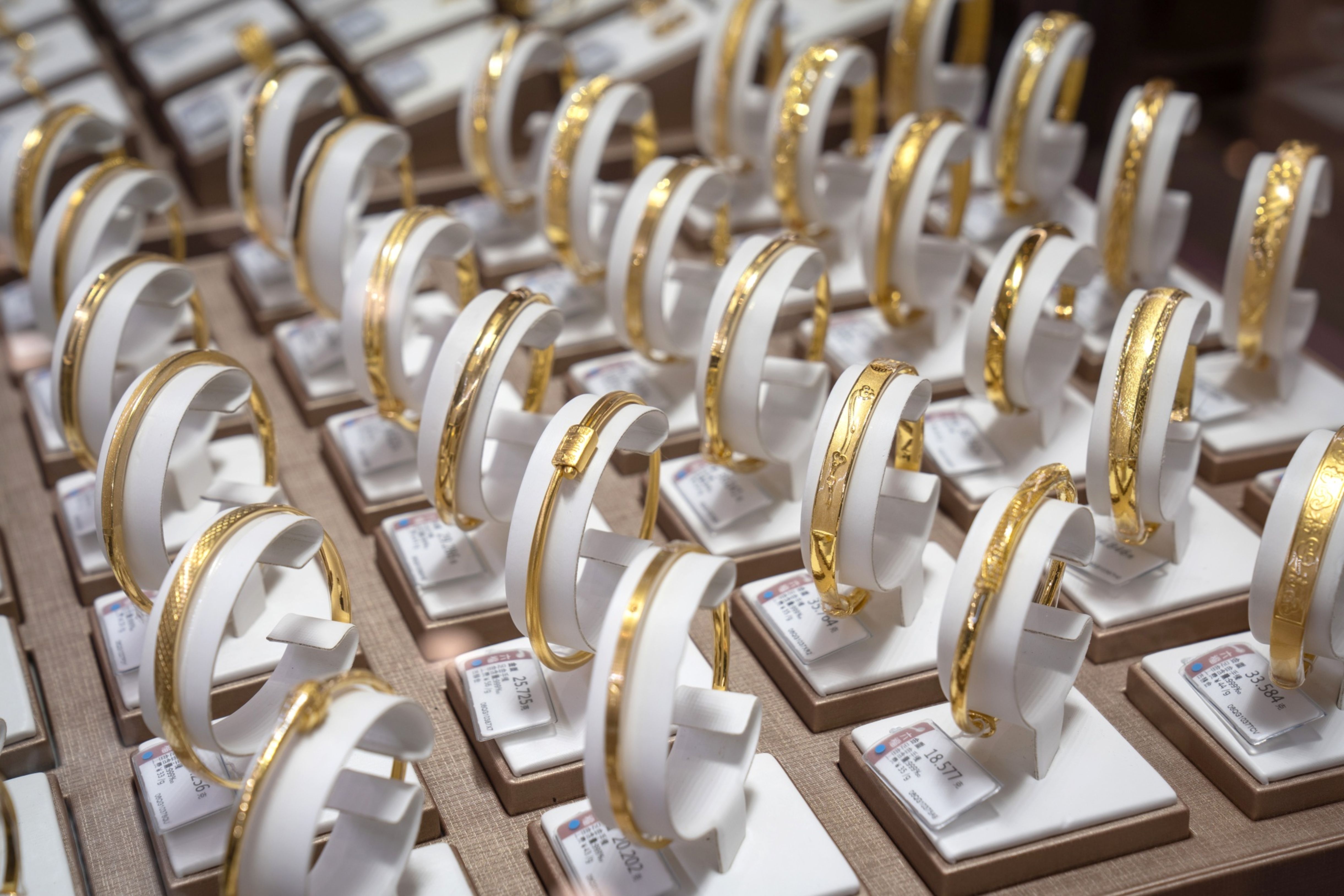 Gold bangles on display in Beijing. (Photographer: Yan Cong/Bloomberg)