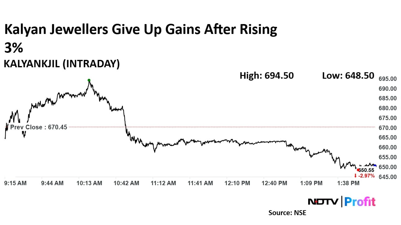 Kalyan Jewellers' stock rose as much as 3.59% during the day to Rs 694.50 apiece on the NSE. It was trading 2.98% lower at Rs 650.50 apiece, compared to a 0.09% decline in the benchmark Nifty 50 as of 2:07 p.m.