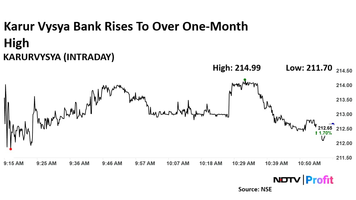 Shares of Karur Vyasa Bank rose as much as 2.82% to Rs 214.99 apiece, the highest level since Feb. 21. It pared gains to trade 1.77% higher at Rs 212.80 apiece, as of 10:57 a.m. This compares to a 0.03% advance in the NSE Nifty 50.