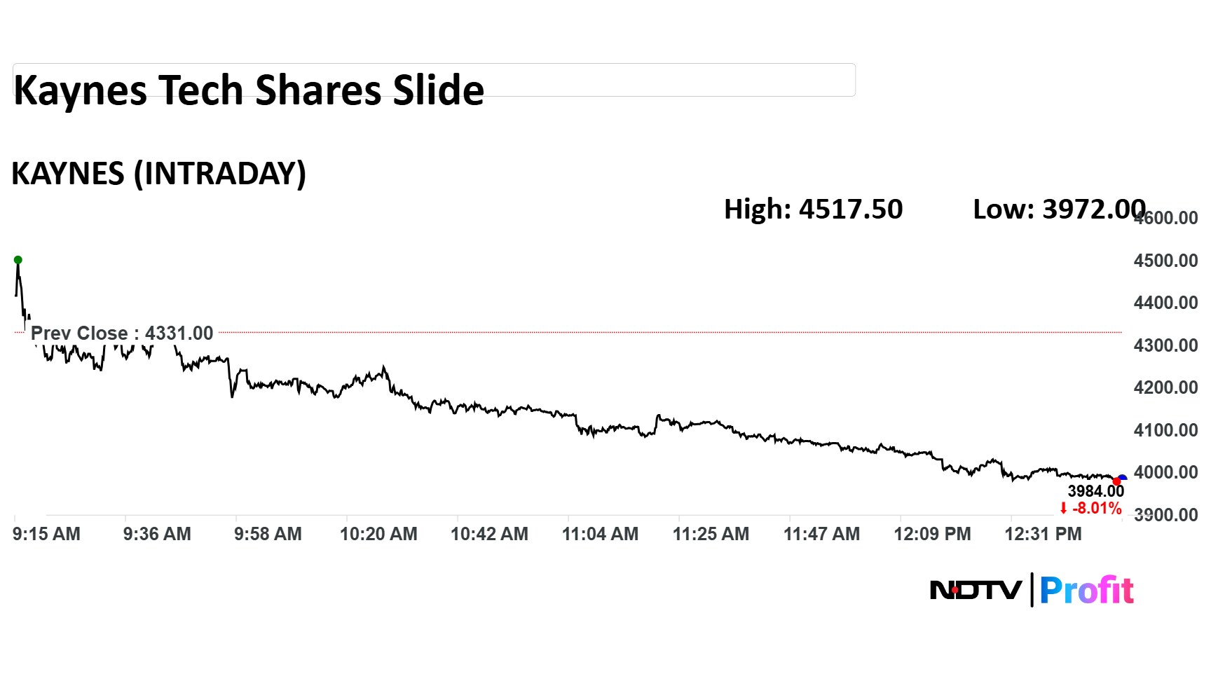 On Wednesday, shares of Kaynes Tech opened 2% lower at Rs 4,417.50 on the NSE and plunged over 8% to hit an intraday low of Rs 3,980.00. The stock trades nearly 12% lower from its all-time high. The electronics company commands a market cap of Rs 26,666.39 crore.