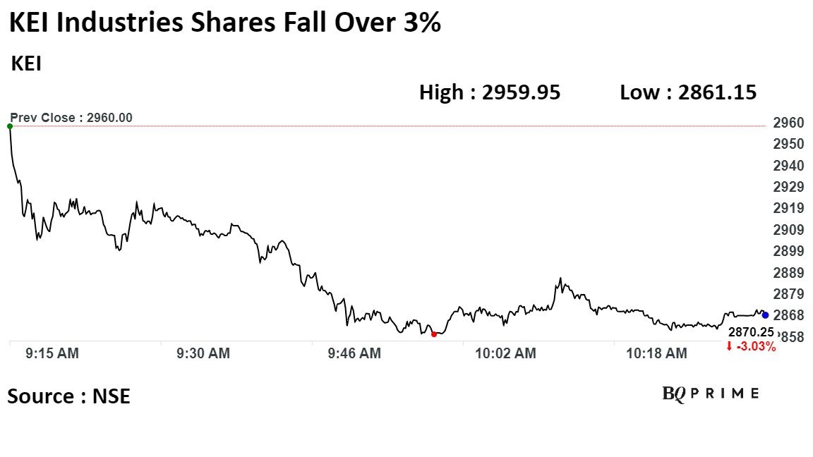 Shares of KEI Industries Ltd. fell as much as 3.51%, the lowest since Nov. 21, before paring some loss to trade 3.03% lower at 10:36 a.m.