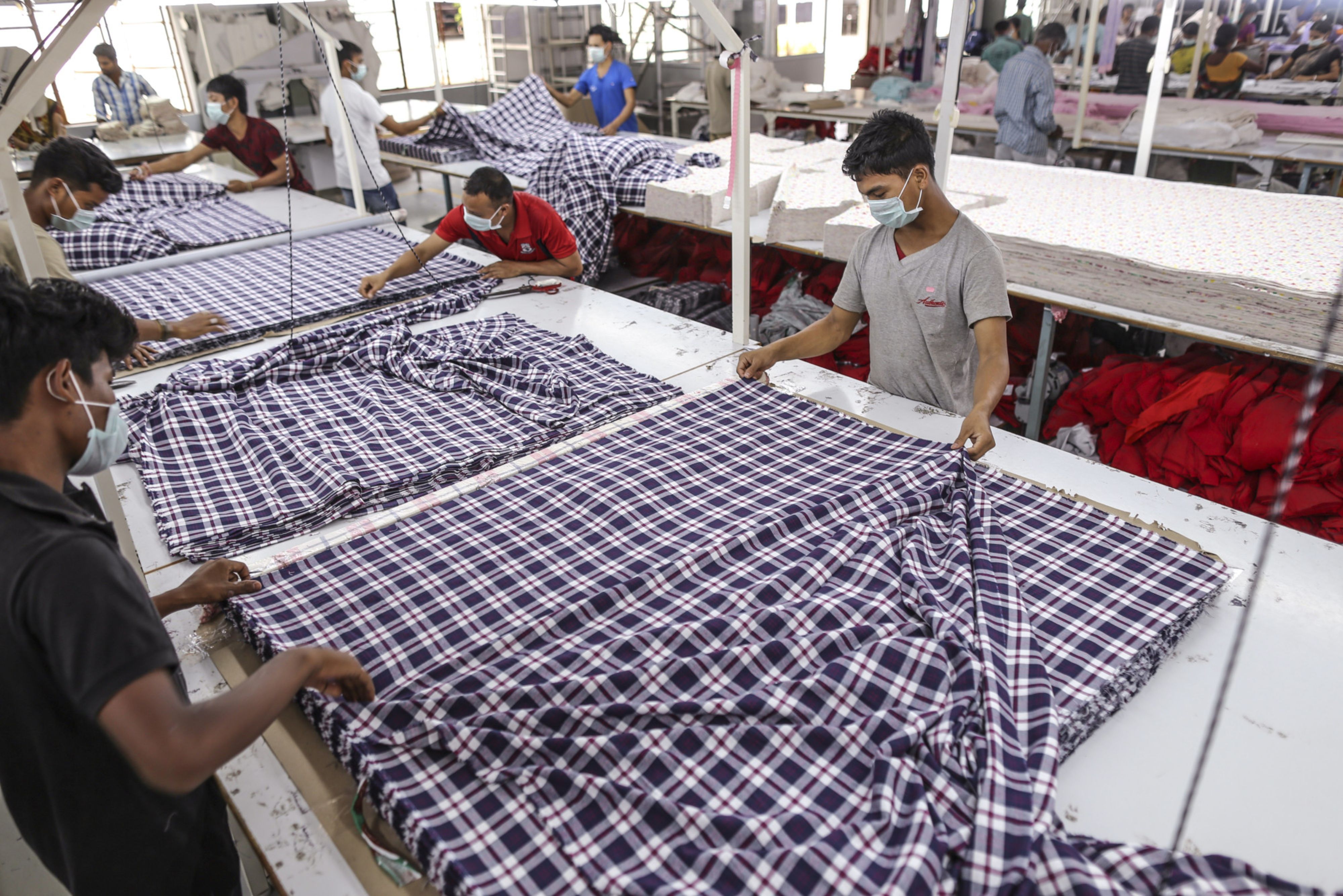 Employees wearing masks handle fabric on the cutting division production line. (Photographer: Dhiraj Singh/Bloomberg)