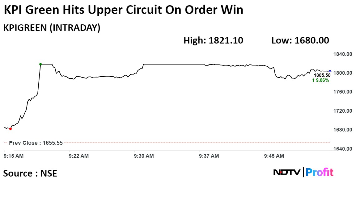 Shares of KPI Green Energy Ltd. hit the upper circuit to an all-time high on Wednesday after its subsidiary won an order for a 5-megawatt solar power plant.