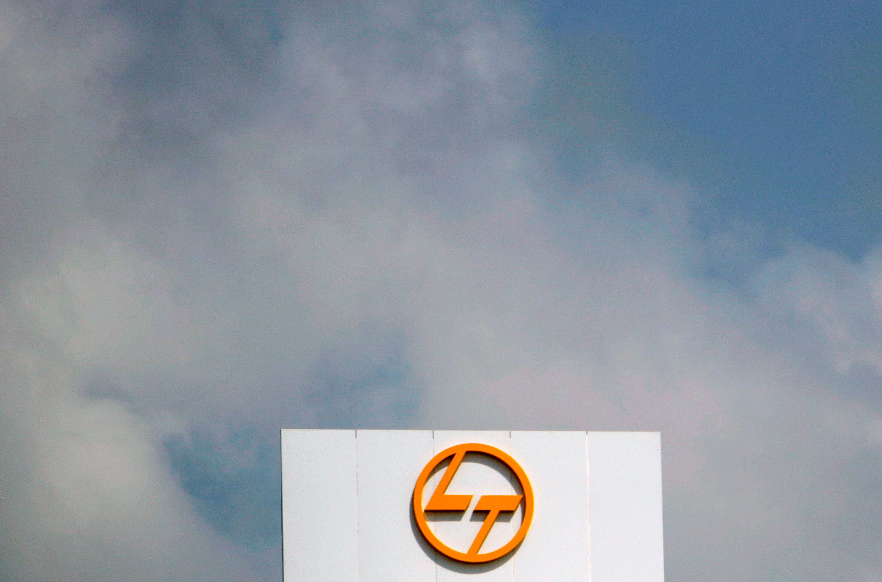 The logo for Larsen & Toubro Ltd. is displayed at the company’s headquarters in Mumbai, India. (Photographer: Adeel Halim/Bloomberg News)
