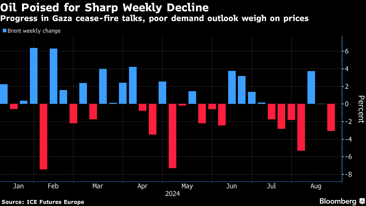 (Bloomberg) -- Oil headed for a weekly loss — after hitting the lowest close since January midweek — on a challenging demand outlook, sinking product prices, and US efforts to secure a cease-fire in Gaza.