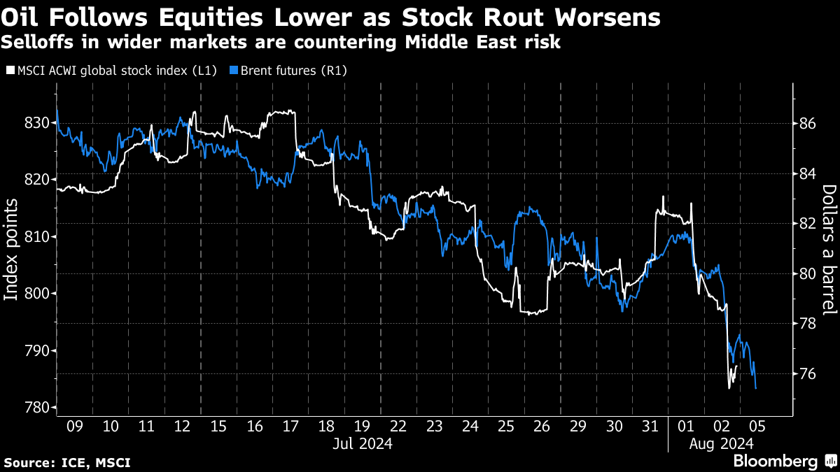 Brent futures slipped toward $75 a barrel — erasing this year's gains — and hit the lowest level since January. West Texas Intermediate dropped below $72. A rout in global equities worsened on Monday on concerns around the economic outlook.
