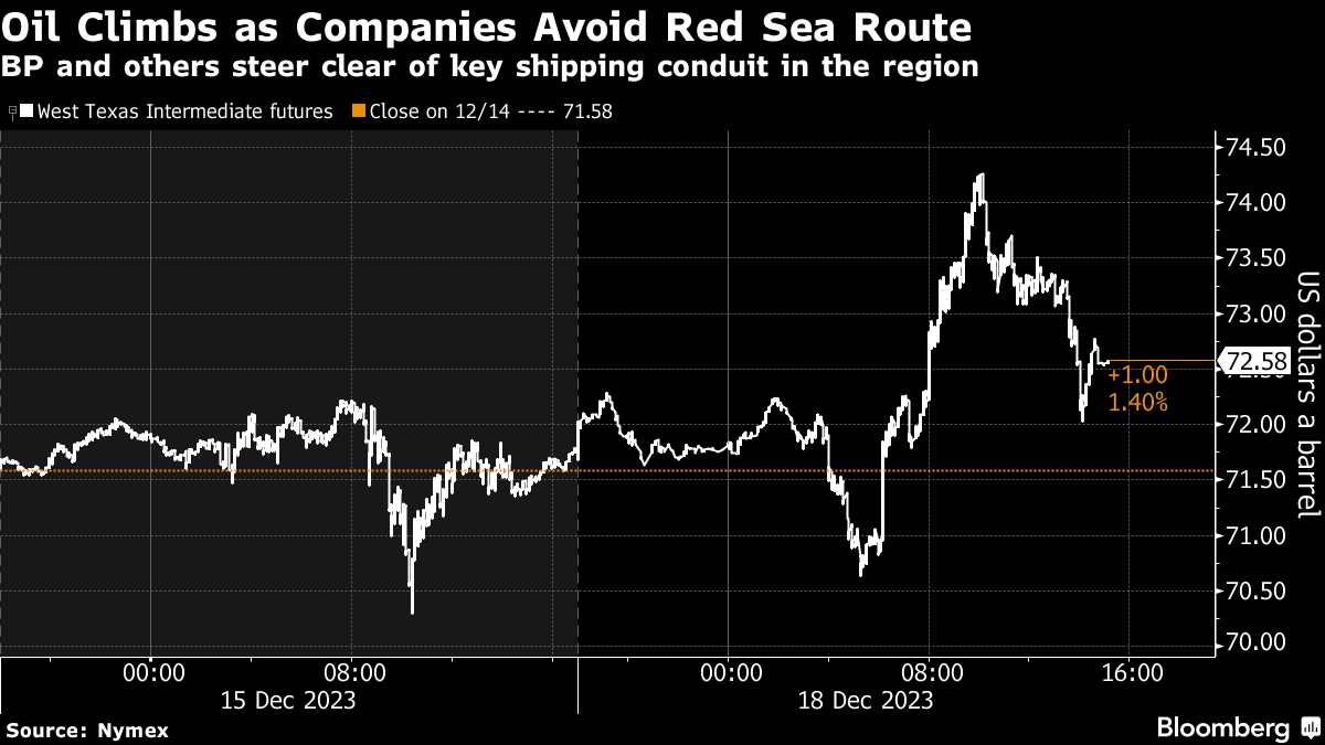 West Texas Intermediate advanced 1.5% to settle above $72 a barrel at the highest since Dec. 4. Prices earlier spiked as much as 4%. BP Plc said it will pause all shipments through the Red Sea, while Equinor ASA is diverting vessels away from the region. Euronav NV, a major shipowner, is also keeping its ships clear, citing safety concerns.