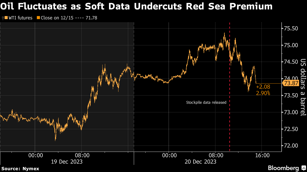 West Texas Intermediate's February contract swung in a roughly $2 range and settled near $74 after government data revealed a large buildup in US stockpiles and record production, adding to persistent concerns about oversupply. Inventories at the key storage hub in Cushing, Oklahoma, remained at the highest since August, pressuring timespreads.