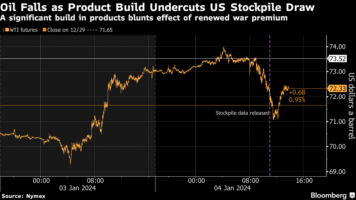 West Texas Intermediate edged lower to settle near $72 a barrel after swinging in a $3 range. Traders weighed rising tensions in the Middle East against data showing US gasoline inventories swelling the most since in three decades and implied demand dropping to a yearly low. Crude supplies had a more mixed picture, with inventories at the key storage hub in Cushing, Oklahoma, rising to the highest since July while total US stockpiles fell.