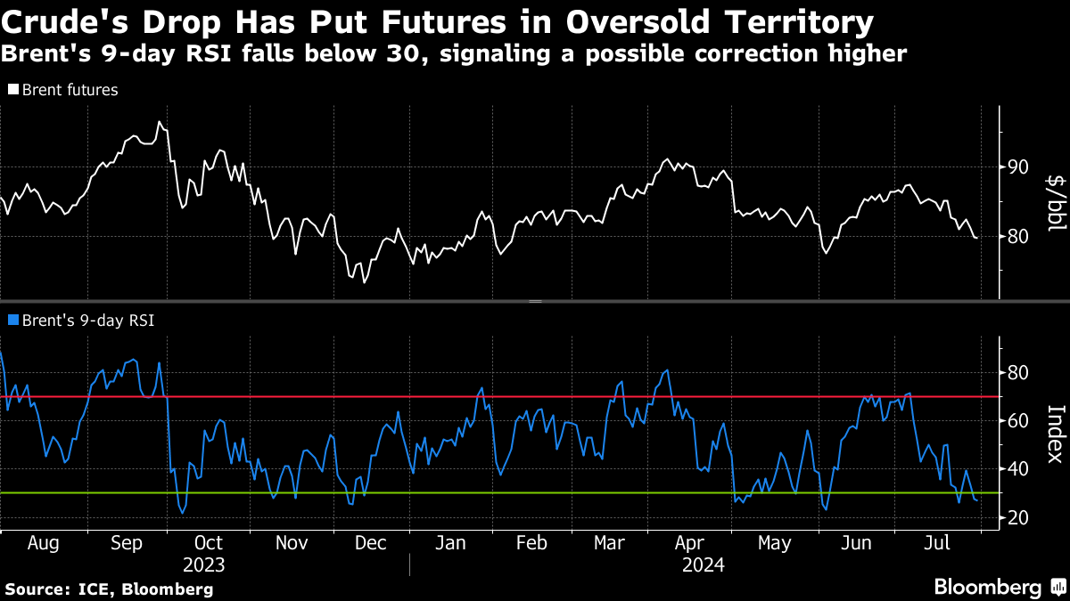 Brent crude held below $80 a barrel after losing more than 3% over the previous two sessions, while West Texas Intermediate was around $75. Banks including Citigroup Inc. have downgraded their growth forecasts for Asia's biggest economy, while export prices of US oil heading to the region are also weakening. China's second-half imports are also seen staying weak.