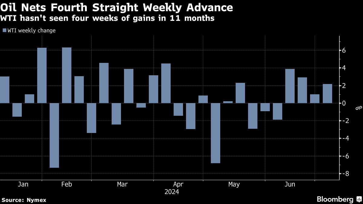 West Texas Intermediate fell to settle near $83 a barrel on Friday, but still cemented a 2% weekly advance. The American benchmark hasn't risen for four consecutive weeks since August 2023.