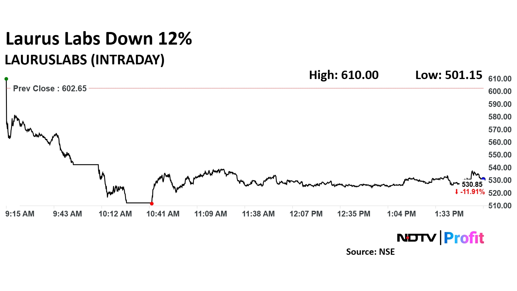 Laurus Labs' scrip fell as much as 16.8% to Rs 501.15 apiece on the NSE, the lowest level since Nov. 22. It pared some of the losses to trade 10.9% lower at Rs 536.55 apiece, as of 2:25 p.m. This compares to a 1% decline in the benchmark Nifty 50 index.