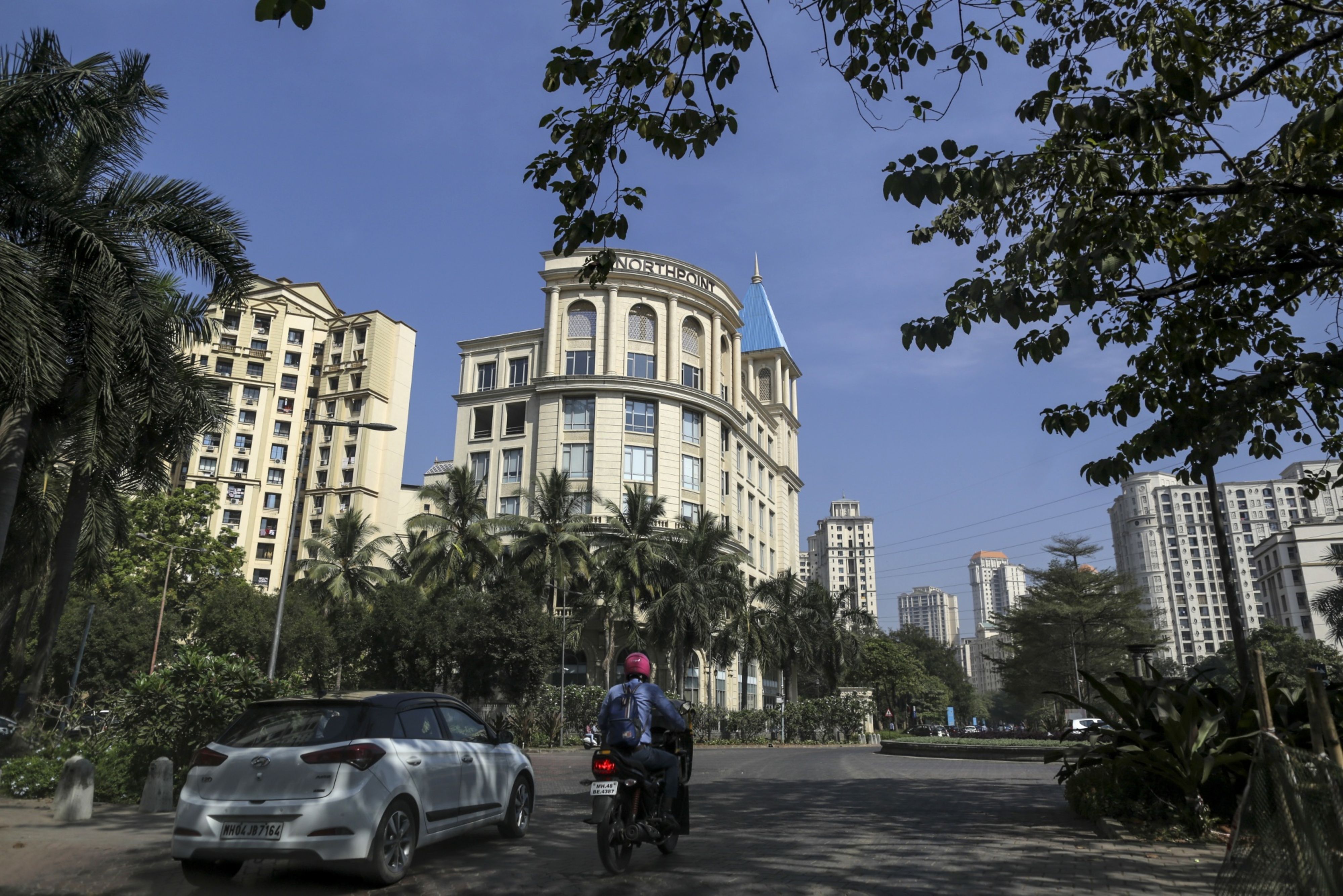 A motorcyclist travels towards a roundabout at a residential housing complex in Thane, Maharashtra. (Photographer: Dhiraj Singh/Bloomberg)