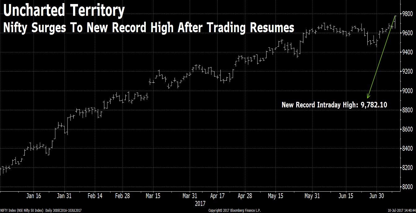 The 51-stock benchmark resumed trading at 9,727.65. Most sectoral indices traded with gains with PSU Banks and Pharmaceutical stocks leading the way.