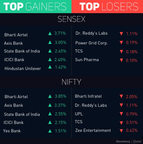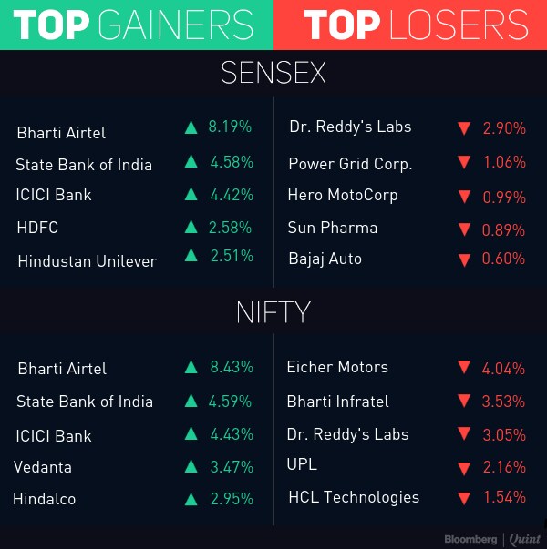 • Bharti Airtel was the top Nifty gainer, up 7.4 percent. ICICI Bank, State Bank of India, Axis Bank and Vedanta were also among the gainers