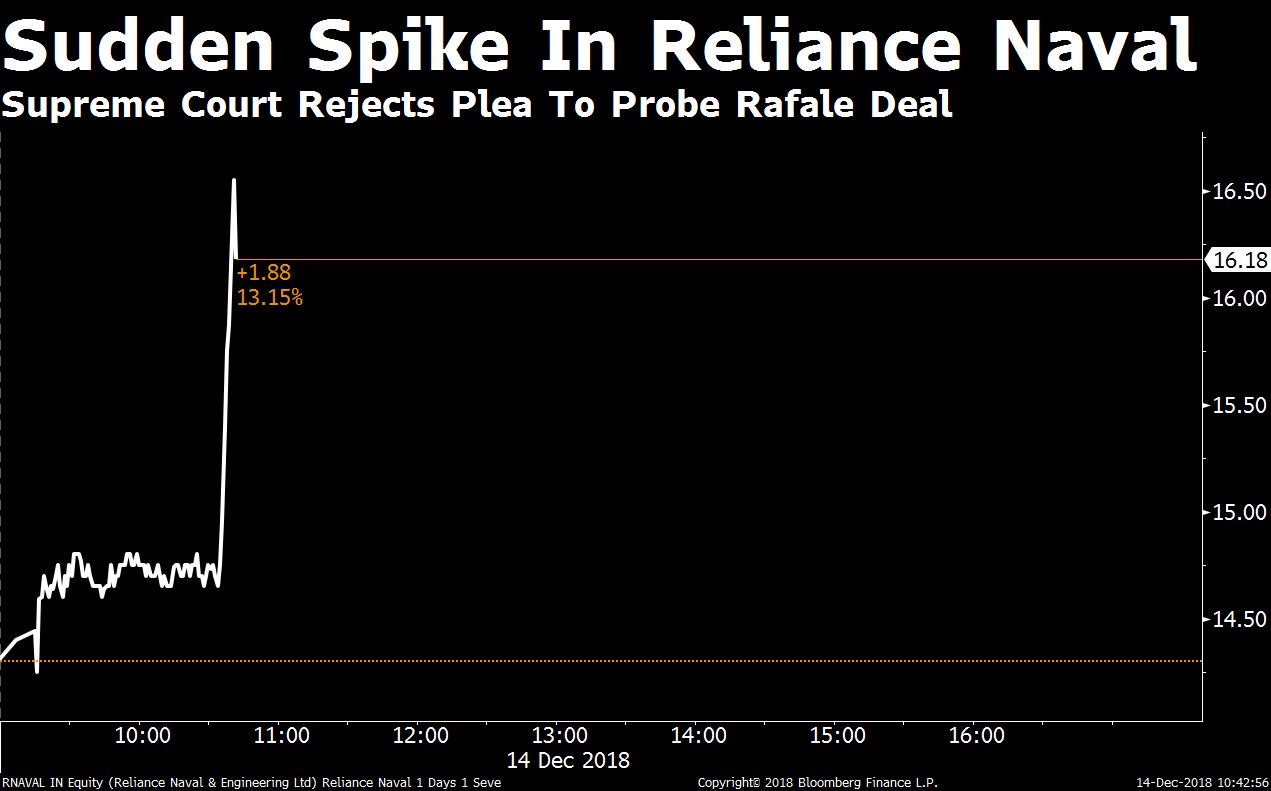 Shares of Anil Dhirubhai Ambani Group companies were trading higher after the Supreme Court rejected pleas to to probe India’s Rafale fighter jet deal with France, blunting the opposition’s attack on Prime Minister Narendra Modi and Anil Ambani in the multi-billion-dollar purchase.