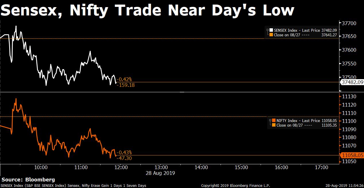 The S&P BSE Sensex traded 0.90 percent lower at 37,303.76 and the NSE Nifty 50 fell 0.91 percent to 11,001.80 as of 2:45 p.m. The broader markets represented by the NSE Nifty 500 Index fell 0.96 percent.