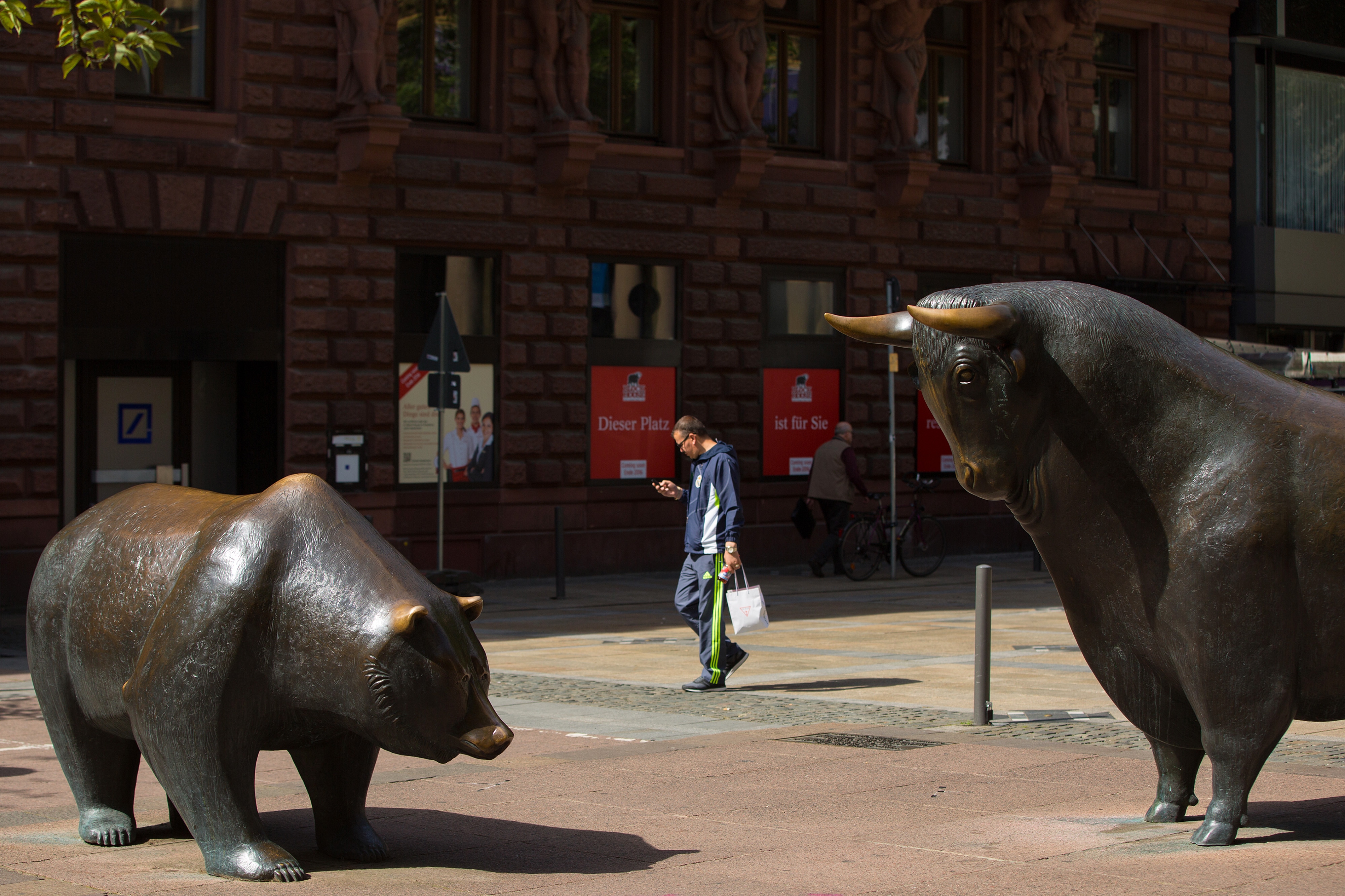 A pedestrian walks past a bear and a bull statue outside the Frankfurt Stock Exchange in Frankfurt, Germany (Photographer: Krisztian Bocsi/Bloomberg)
