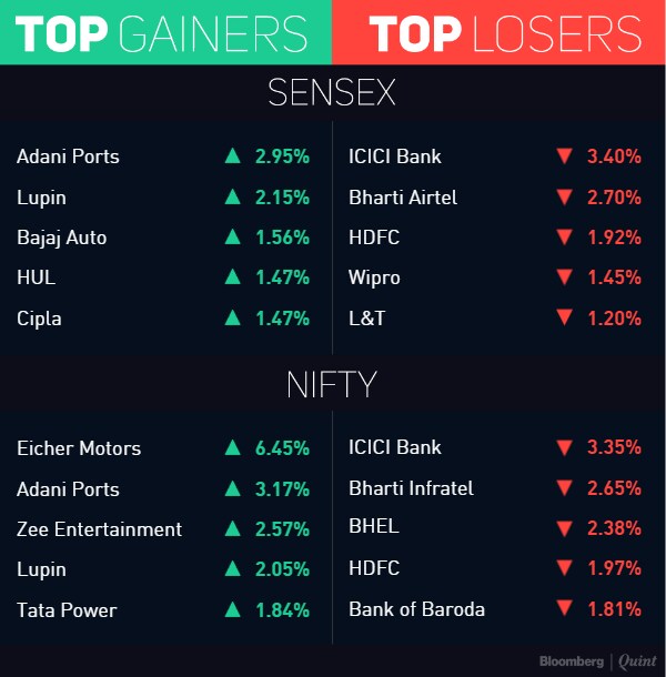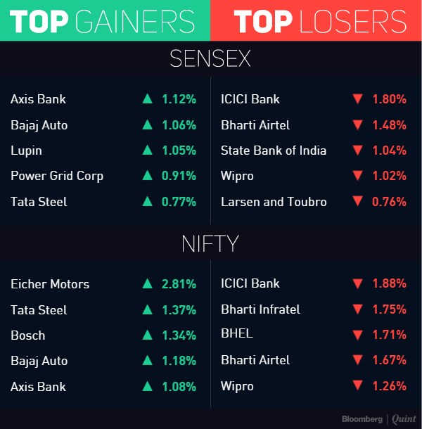 The S&P BSE Sensex loses 0.5 percent to 28,051; while the NSE Nifty declines 0.3 percent to 8,638, but advance 4.9 percent for the month, best since March.
