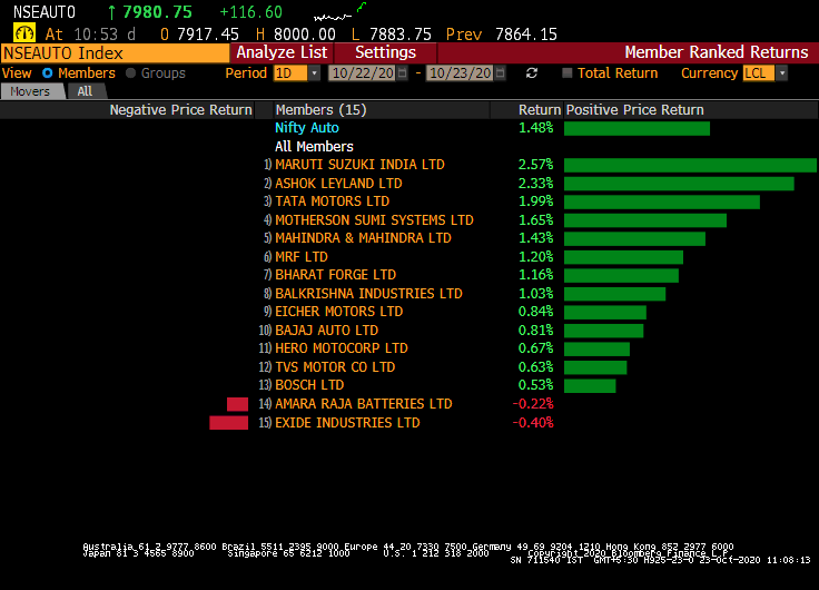 Auto stocks were the top performers in today's session. The Nifty Auto index was the top sectoral gainer, ending 3% higher. Three out of the top five gainers on the Nifty 50 index, were auto stocks (Maruti, M&M, Bajaj Auto).