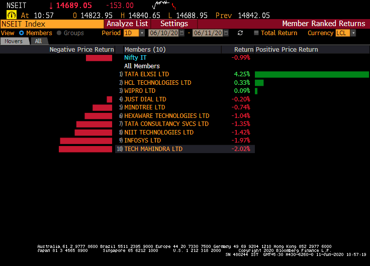 • Nifty I.T. Index is the top sectoral laggard; down 0.65%