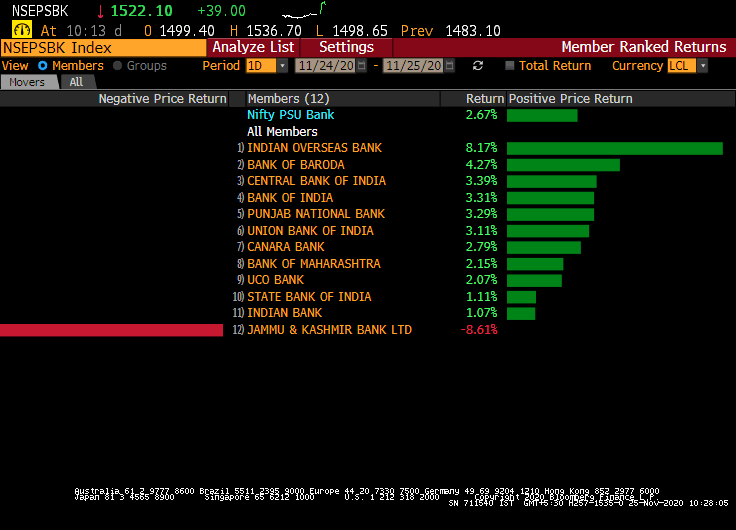 All sectoral indices ended lower with the exception of the PSU Bank index which ended off the day's high, but with gains of 1.7%.