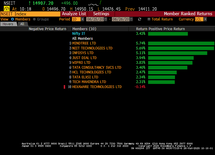 Among the sectoral indices, I.T. remained the outperformer, with the sectoral index ending with gains of 3.9%. The PSU Bank index was the other sectoral gainer, ending 1% higher.
