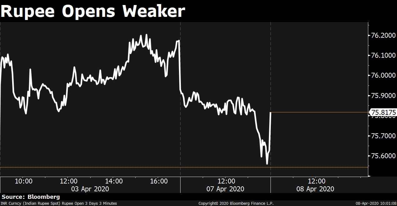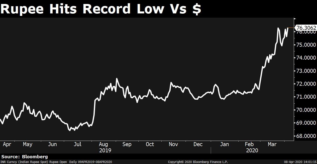 • The rupee hits a fresh record low of 76.34 against the U.S. dollar before ending at 76.30.