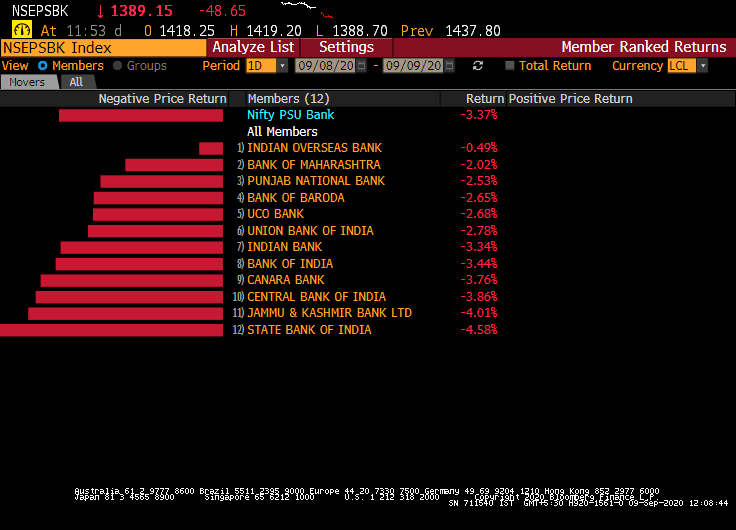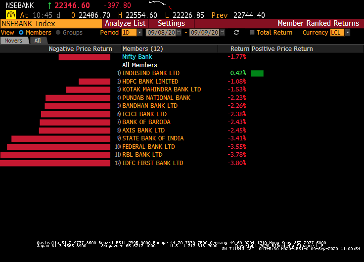 Among the sectoral indices, the Nifty Bank ended over 450 points or 2.1% lower and were among the top sectoral laggards along with the PSU bank index which ended with losses of 2.9%.