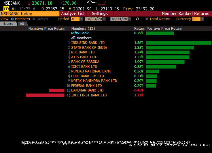 As mentioned earlier, it was the Nifty Bank that led the recovery in the final hour. The Index recovered over 700 points from the day's low of 23,149 to end 1.6% higher at 23,874. 10 out of the 12 index constituents, which were declining at mid-day trading, ended with gains.