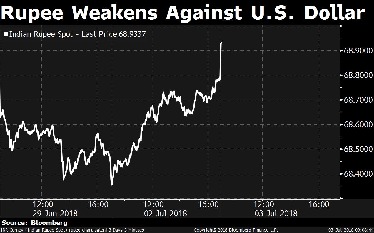 The rupee could potentially test 70 per dollar soon. The key negatives are an escalating trade war fears between the U.S. and China and high oil prices, according to Oxford Economics. Also, India's key industries' output for the month of May rises less than estimated at 3.6 percent.