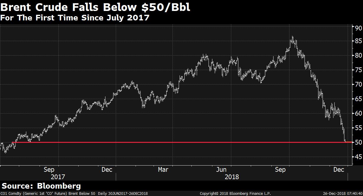 Shares of airline operators rose after Brent crude dropped below $50 per barrel for first time since July 2017.