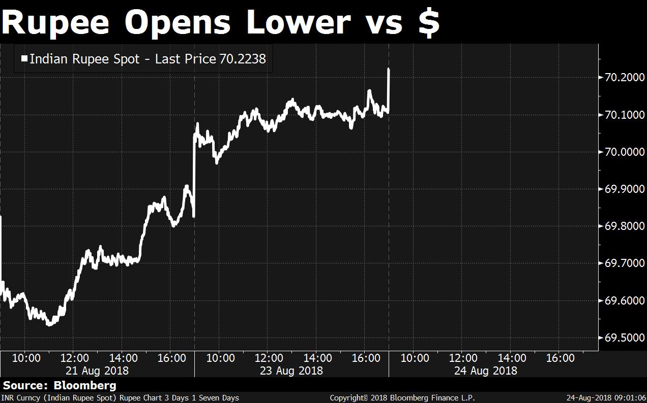 The dollar was trading higher overseas ahead of an address by Fed Reserve chair Jerome Powell at Jackson Hole. The rupee fell 0.4 percent on Thursday to end at 70.1150 with the implied opening from the forwards, suggesting it will start trading at 70.21 on Friday.