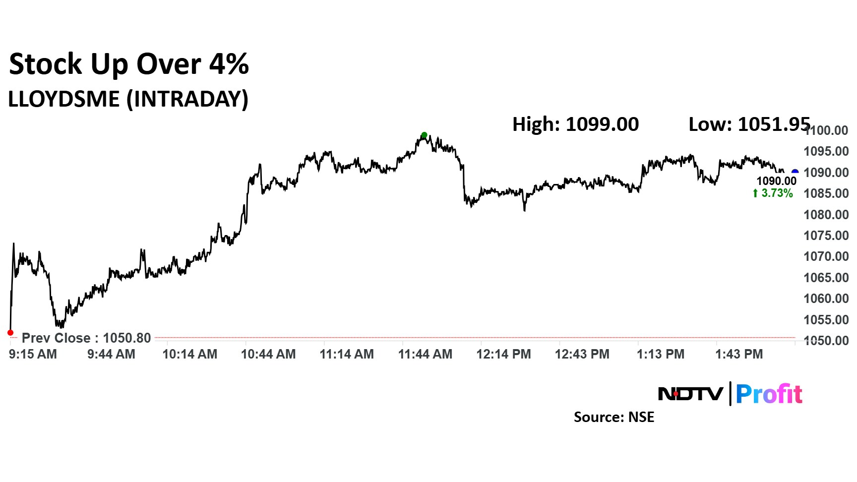 Lloyds Metals and Energy share price rose as much as 4.59% to Rs 1,099 apiece. It pared gains to trade 4% higher at Rs 1,092.80 apiece, as of 2:07 p.m. This compares to a 0.24% decline in the NSE Nifty 50 Index.