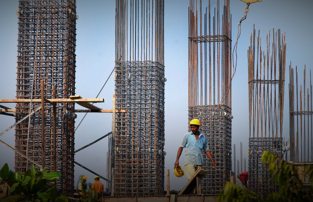 Workers install steel rods on the construction site of a proposed bridge in Mumbai (Photographer: Abhijit Bhatlekar/Bloomberg News.)